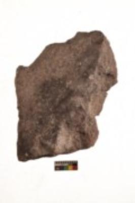 | Description / विवरण | Specimen of an uneven shaped saddle quern. It is dark brown in colour and medium smooth in texture. It has flat base. |