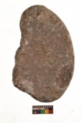 | Description / विवरण | Specimen of a roughly oval shaped smasher with coarse surface. It is brownish in colour and has flat base. |