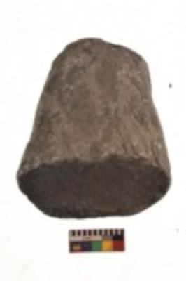 | Description / विवरण | Specimen of a knob shaped smasher with rough surface. It is dark brown in colour and has flat base. |