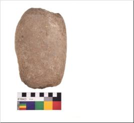 | Description / विवरण | Specimen of a roughly oval shaped saddle quern. It is creamish in colour and fine in texture. It is round in cross section. |