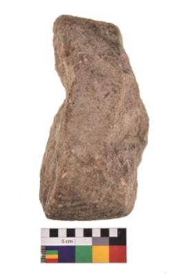 | Description / विवरण | Specimen of a roughly rectangular shaped saddle quern with rough surface. It is blackish in colour and has flat base. |