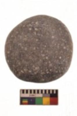 | Description / विवरण | Specimen of a roughly round shaped hammerstone. It is blackish in colour and partially smooth in texture. |