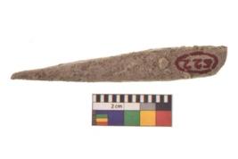 | Description / विवरण | Specimen of a bone point made on long bone, it is rectangular cross section in shape with flat and thick body. |
