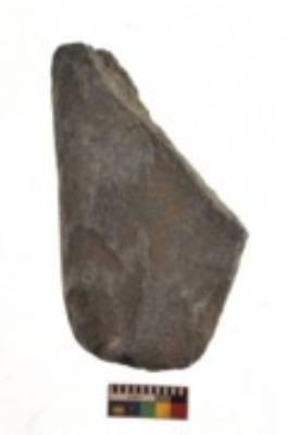 | Description / विवरण | Specimen of an uneven shaped saddle quern. It is dark brown in colour and partially rough in texture. It has flat base. |