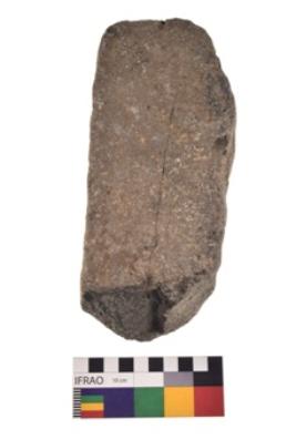 | Description / विवरण | Specimen of a roughly rectangular shaped saddle quern with smooth surface. It is blackish in colour and has flat base. |