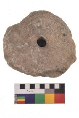 | Description / विवरण | Specimen of a round shaped grinding stone with smooth surface. It is creamish in colour and has flat base. |