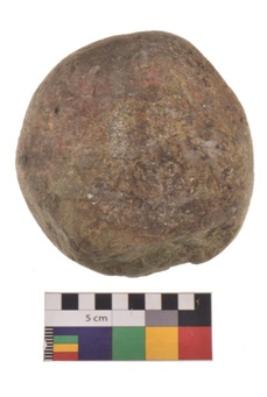 | Description / विवरण | Specimen of a roughly round shaped hammerstone with smooth surface. It is brownish in colour and round in cross section. |