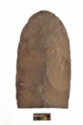 | Description / विवरण | Specimen of a roughly oval shaped saddle quern. It is brownish in colour and irregular partially smooth surface in texture. |