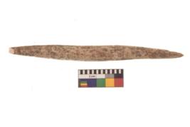 | Description / विवरण | Specimen of a bone point made on long bone, it is rounded cross section in shape with flat and thick body. |
