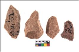 | Description / विवरण | Specimen of flake tools with prominent flaking marks. They are made up of a short flakes with sides trimmed. |