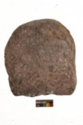 | Description / विवरण | Specimen of a roughly oval shaped grinding stone. It is dark brown in colour and rough in texture. It has flat base. |