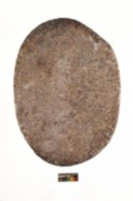 | Description / विवरण | Specimen of an oval shaped smasher with coarse surface. It is dark brown in colour and has flat base. |