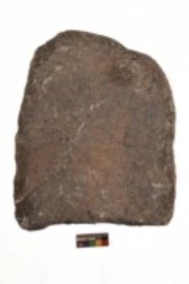 | Description / विवरण | Specimen of a roughly rectangular shaped smasher with coarse surface. It is dark brown in colour and has flat base. |