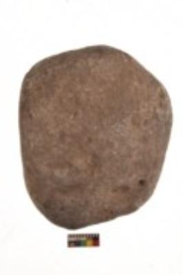 | Description / विवरण | Specimen of an uneven round shaped hammerstone. It is brownish in colour and coarse in texture. It has flat base. |