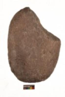 | Description / विवरण | Specimen of a roughly oval shaped smasher with coarse surface. It is brownish in colour and has flat base. |