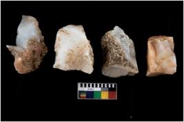 | Description / विवरण | There are n 4 utilized flake cores. Out of them two are made up of Chert and two are made up of Chalcedony. There are multi directional irregular scar pattern on them. Two have blunted edges and two have round edges. |