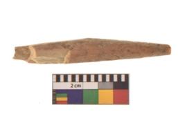 | Description / विवरण | Specimen of a polished bone point made on long bone, it has pointed top, It is rounded cross section in shape with flat and thick body. |