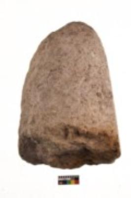 | Description / विवरण | Specimen of a roughly oval shaped saddle quern. It is light brown in colour and rough in texture. It has round cross section. |