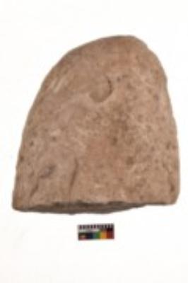 | Description / विवरण | Specimen of a roughly oval shaped grinding stone. It is light brown in colour and rough in texture. It has flat base. |