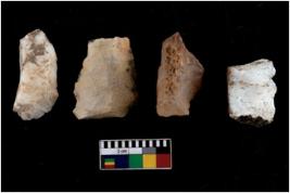 | Description / विवरण | There are n 4 utilized flake cores. Out of them three are made up of Chert and one is made up of Chalcedony. There are multi directional irregular scar pattern on them. One has sharp edge and three are tapering at one end. |