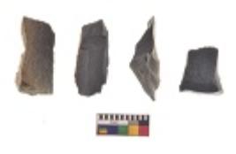 | Description / विवरण | There are n 4 utilized flake cores. There are multi directional irregular scar pattern on both dorsal and ventral face of the flake cores. Three are tapering at one end and one has blunted edge. |