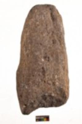| Description / विवरण | Specimen of a roughly rectangular shaped saddle quern. It is brownish in colour and coarse in texture. It has flat base. |