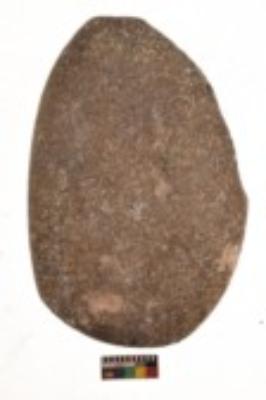 | Description / विवरण | Specimen of an oval shaped saddle quern with coarse texture. It is dark brownish in colour and has flat base. |