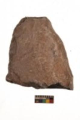| Description / विवरण | Specimen of an uneven shaped grinding stone. It is brownish in colour and it has rough surface and flat base. |