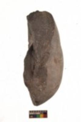 | Description / विवरण | Specimen of a roughly rectangular shaped saddle quern. It is dark brown in colour and coarse in texture. It has flat base. |