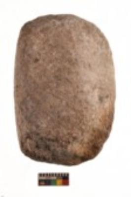 | Description / विवरण | Specimen of an oval shaped saddle quern with partially smooth surface. It is brownish in colour and has flat base. |