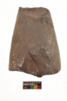 | Description / विवरण | Specimen of a roughly rectangular shaped saddle quern. It is brown in colour and partially smooth texture of surface. It has flat base. |