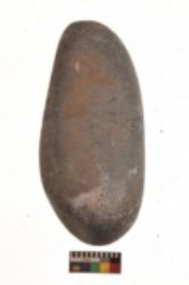 | Description / विवरण | Specimen of an oval shaped saddle quern with smooth texture of surface. It is dark brownish in colour and has flat base. |