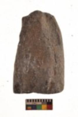 | Description / विवरण | Specimen of a roughly rectangular shaped saddle quern. It is dark brown in colour and rough texture of surface. It has flat base. |