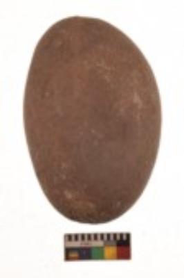 | Description / विवरण | Specimen of an oval shaped saddle quern with partialltay smooth texture of surface. It is dark brownish in colour and has flat base. |