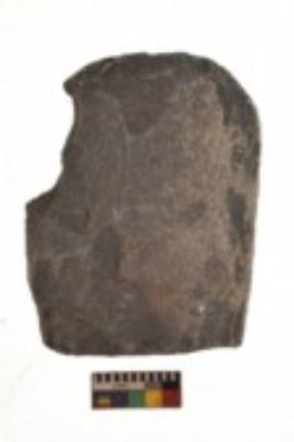 | Description / विवरण | Specimen of a roughly rectangular shaped saddle quern. It is dark brown in colour and coarse in texture. It has flat base. |