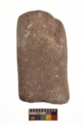 | Description / विवरण | Specimen of a roughly rectangular shaped saddle quern. It is dark brown in colour and coarse texture of surface. It has flat base. |