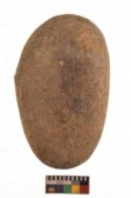 | Description / विवरण | Specimen of an oval shaped saddle quern with partially smooth texture of surface. It is dark brownish in colour and has flat base. |