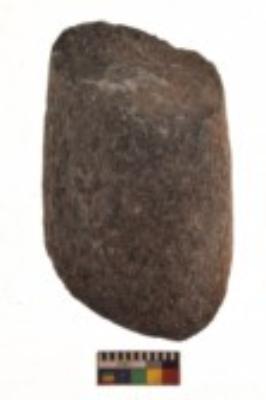 | Description / विवरण | Specimen of an oval shaped saddle quern with coarse texture of surface. It is dark brownish in colour and has flat base. |