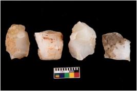 | Description / विवरण | Four utilised worked cores with sharp edges. Some of them are tapering at one end. Removal of flakes from few sides. |