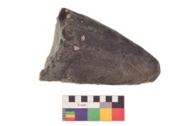 | Description / विवरण | Specimen of a roughly oval shaped saddle quern. It is blackish in colour and smooth in texture. It is round in cross section. |