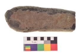 | Description / विवरण | Specimen of an handaxe with one elonagted side for holding purpose. . It is blackish in colour and smooth in texture. |
