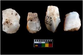 | Description / विवरण | Four utilised worked cores with sharp edges. Some of them are tapering at one end. Removal of flakes from few sides. |