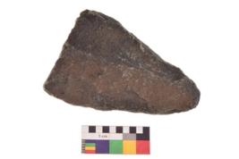 | Description / विवरण | Specimen of an handaxe with one elonagted side for holding purpose. It is blackish in colour and coarse in texture. |