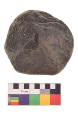 | Description / विवरण | Specimen of a roughly round shaped hammerstone with smooth texture. It is brownish in colour and round in cross section. |