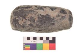 | Description / विवरण | Specimen of a roughly oval shaped saddle quern. It is blackish in colour and smooth in texture. It is round in cross section. |