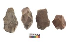 | Description / विवरण | There are n 4 of utilized worked cores and show irregular dominant scar pattern on both dorsal and ventral side. One has a broken tip. |