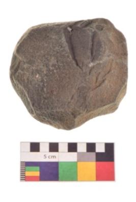 | Description / विवरण | Specimen of a roughly round shaped hammerstone with smooth texture. It is brownish in colour and round in cross section. |