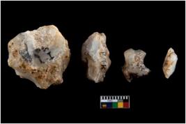 | Description / विवरण | Four utilised worked cores with sharp edges. Some of them are tapering at one end. Removal of flakes from few sides. |