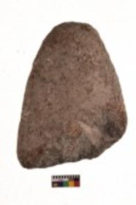 | Description / विवरण | Specimen of a roughly rectangular shaped saddle quern. It is dark brown in colour and partially smooth coarse texture of surface. It has flat base. |