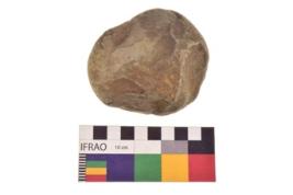 | Description / विवरण | Specimen of a roughly round shaped hammerstone with smooth texture. It is brownish in colour and round in cross section. |